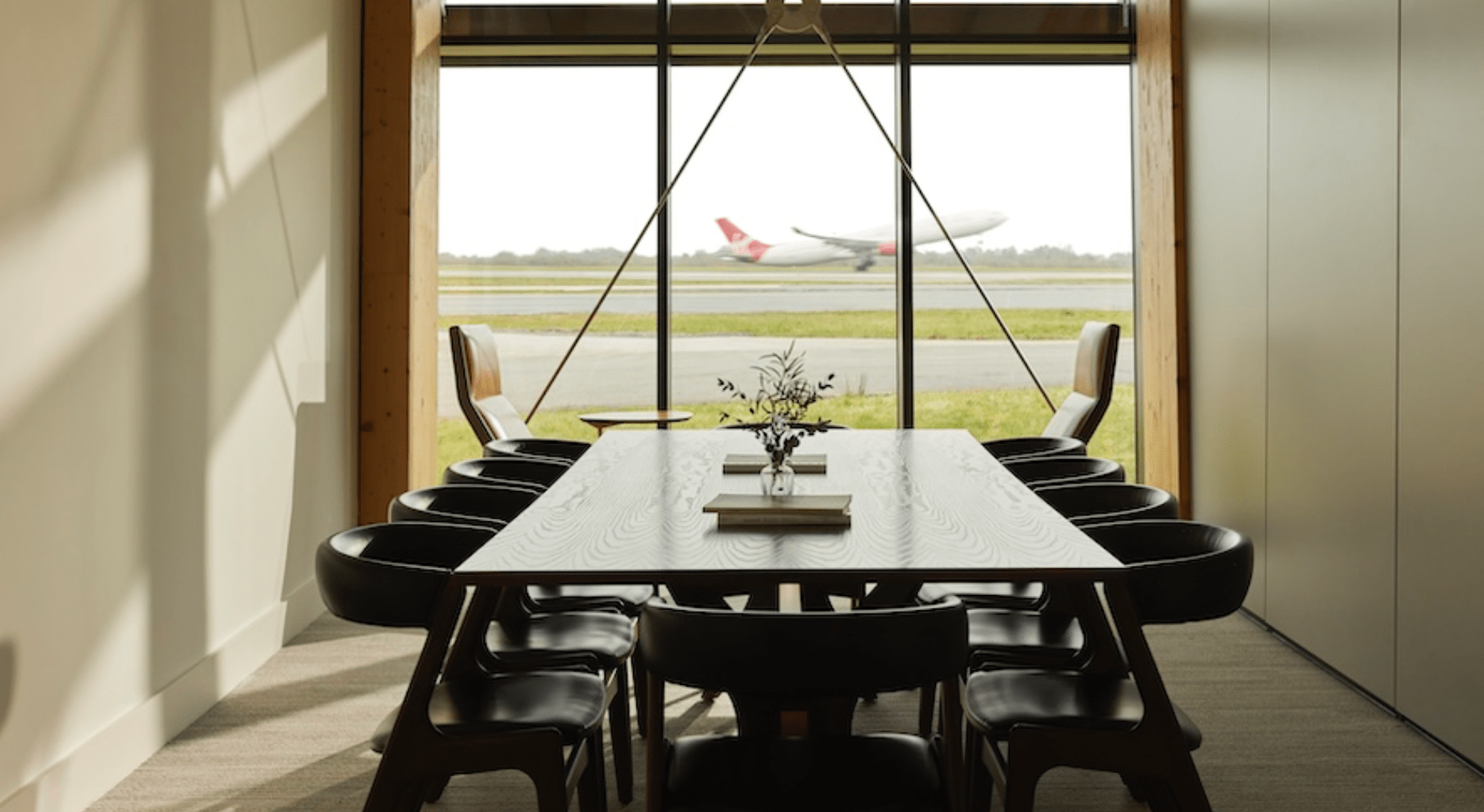 The bright, open-plan lounge features floor-to-ceiling windows, a chic neutral color scheme, and artwork by local artist Conor McGuinness. The space includes a main lounge, private meeting rooms, a baggage drop area, and security and border control facilities. Aether hosts a maximum of 12 guests at a time, ensuring an intimate, quiet atmosphere.