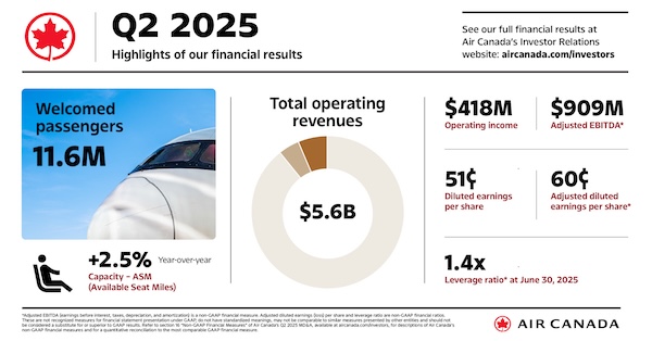 “Air Canada’s second quarter 2025 results showcase the airline’s many strengths in the face of a challenging environment. We generated operating revenues exceeding $5.6 billion, up $113 million from the previous year. Operating income was $418 million, with an operating margin of 7.4%, and adjusted EBITDA was $909 million, with an adjusted EBITDA margin of 16.1%. Operationally, we had an excellent spring, leading all major North American carriers in on-time performance for both May and June, which corresponded with strong gains in customer service scores. We remained disciplined and consistent in executing on a long-term plan that is rooted in Air Canada’s proven commercial strategy, while navigating macroeconomic uncertainty and geopolitical tensions. We have strategically redirected capacity to high-demand markets and captured demand for premium services, leveraging the breadth and strength of our global network. Our results were further lifted by strong performances by Air Canada Cargo, Air Canada Vacations, and Aeroplan—each a key pillar of our diversified business,” said Michael Rousseau, President and Chief Executive Officer of Air Canada.