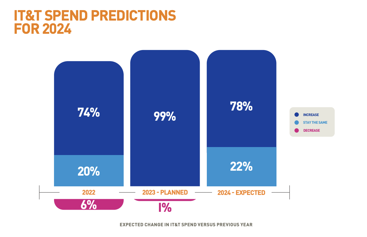- Over two-thirds of airport and airline CIOs expect continued growth into 2024. Key investment priorities include a biometrically enabled passenger journey, leveraging data to unlock operational efficiencies, and green solutions to optimise energy consumption and emissions.