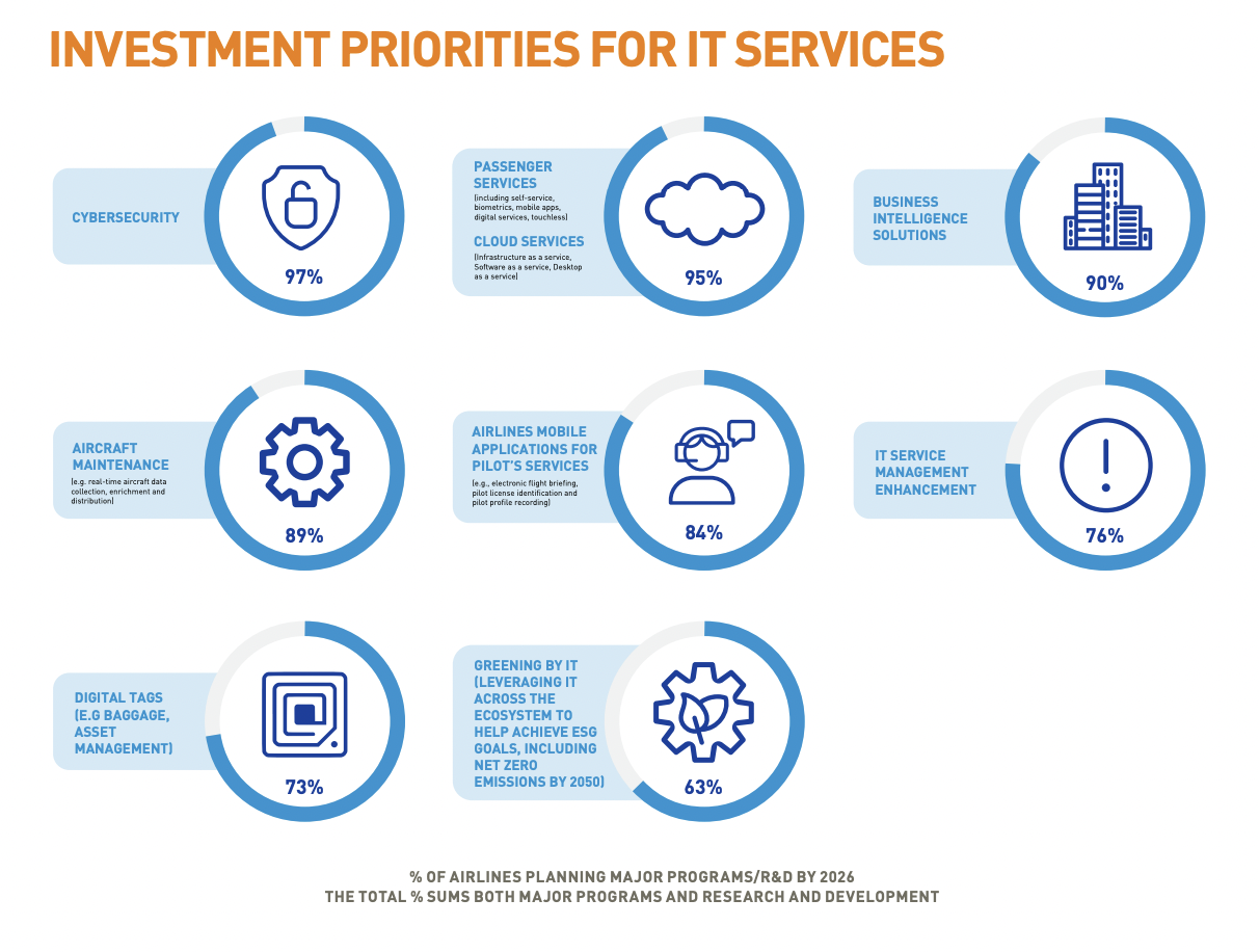 - By 2026, over 90% of airlines plan to have IT in place to boost the efficiency of flight operations and aircraft turnaround. More than half have implemented IT to optimise both aircraft taxiing and the takeoff/landing and cruise phases of flights, with nearly all expecting to have this in place by 2026.