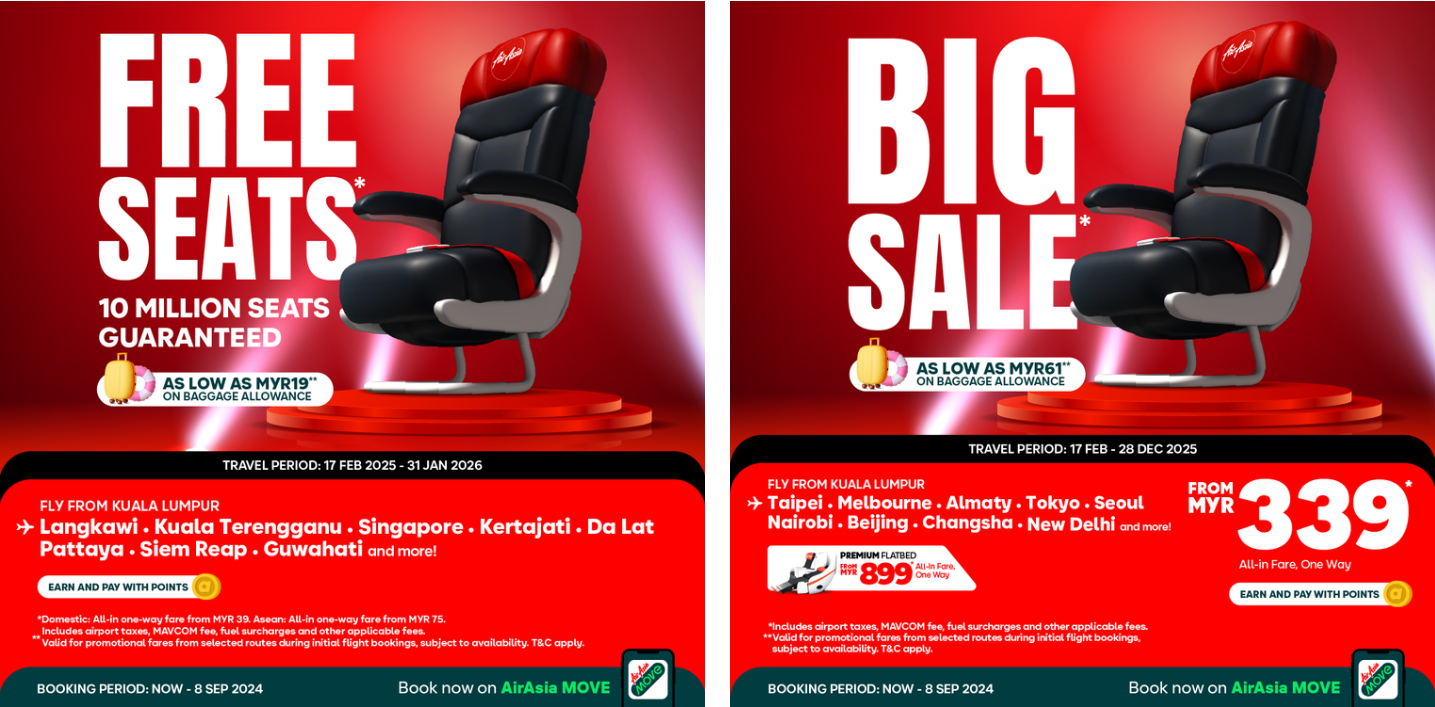 All flights on sale are available for booking today until 8 September 2024 on AirAsia MOVE (formerly airasia Superapp) and airasia.com for the travel period from 17 February 2025 to 31 January 2026. For the BIG Sale, the travel period is from 17 February 2025 to 28 December 2025. AirAsia guests can also purchase check-in baggage at special fares from MYR19 (FREE* Seats) and MYR61 (Big Sale) and are encouraged to pre-book seats, inflight Santan meals and travel insurance to save up to 80 per cent.