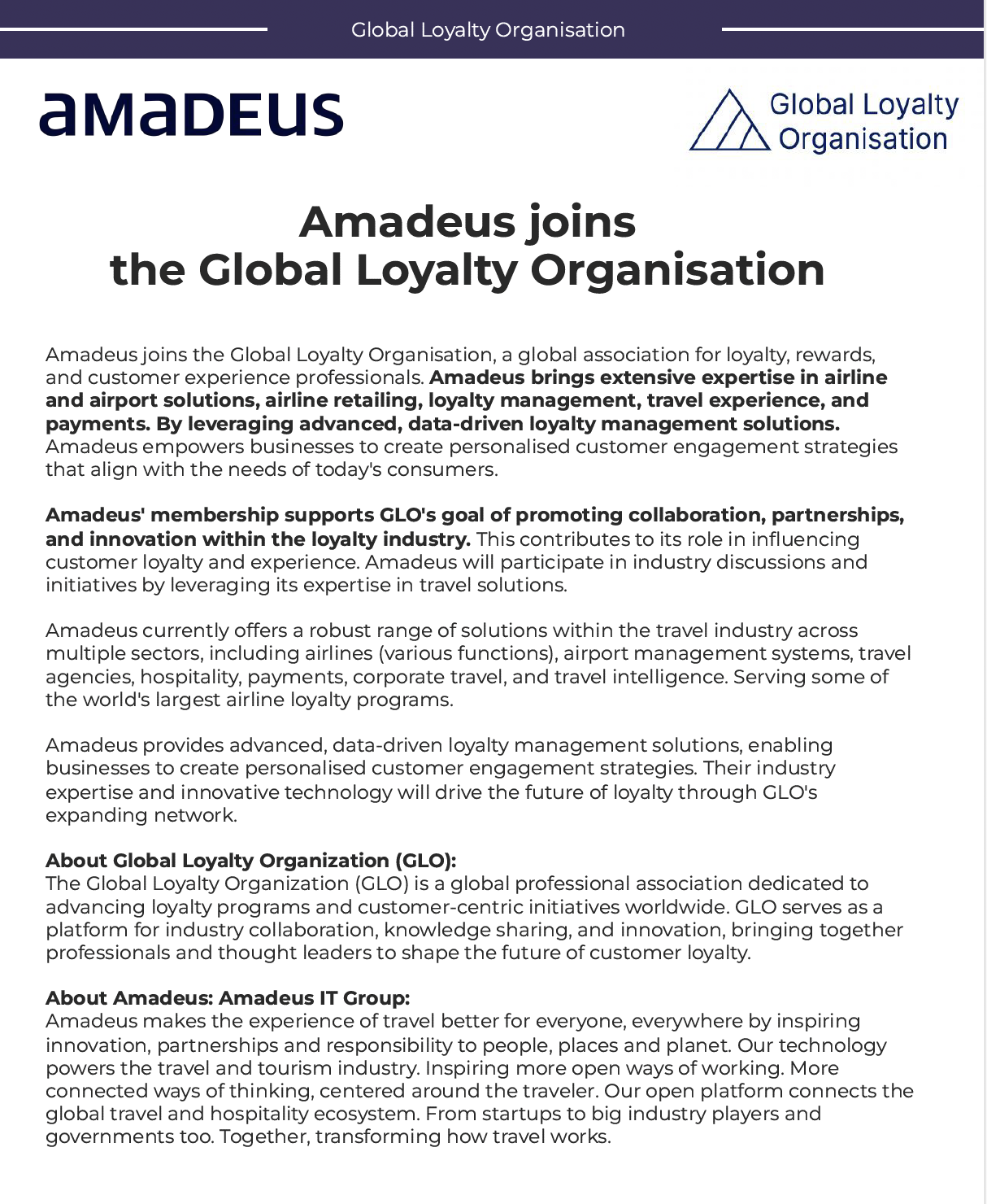 We are delighted to welcome Amadeus, a leading travel technology company, to the Global Loyalty Organisation.