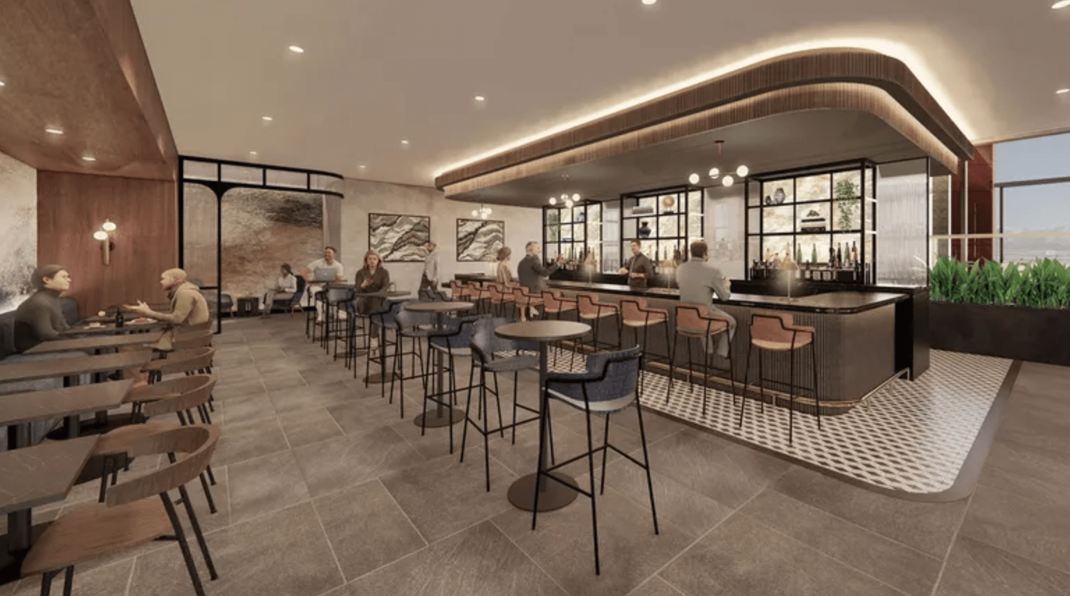 The lounge will span nearly 16,000 square feet and will include an outdoor terrace offering views of the Wasatch Mountains. Inside, guests can enjoy freshly prepared food throughout the day, a Blue Roast by American Express coffee bar, a full bar, and various seating options.