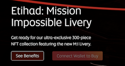 For the latest Mission: Impossible livery NFT, Etihad are providing even more benefits to the limited 300-piece issue. As before, members can enjoy 12-month Etihad Silver Tier promotion, which includes priority check-in, 25% extra Etihad Guest Miles, lounge access at Abu Dhabi International, and more. Additionally, buyers will be granted membership to the Etihad: Virtual Club, which provides an additional 10% extra miles, a fast-track promotion from Silver to Gold Tier for 6 months, and a customised Etihad membership card for online and app use.