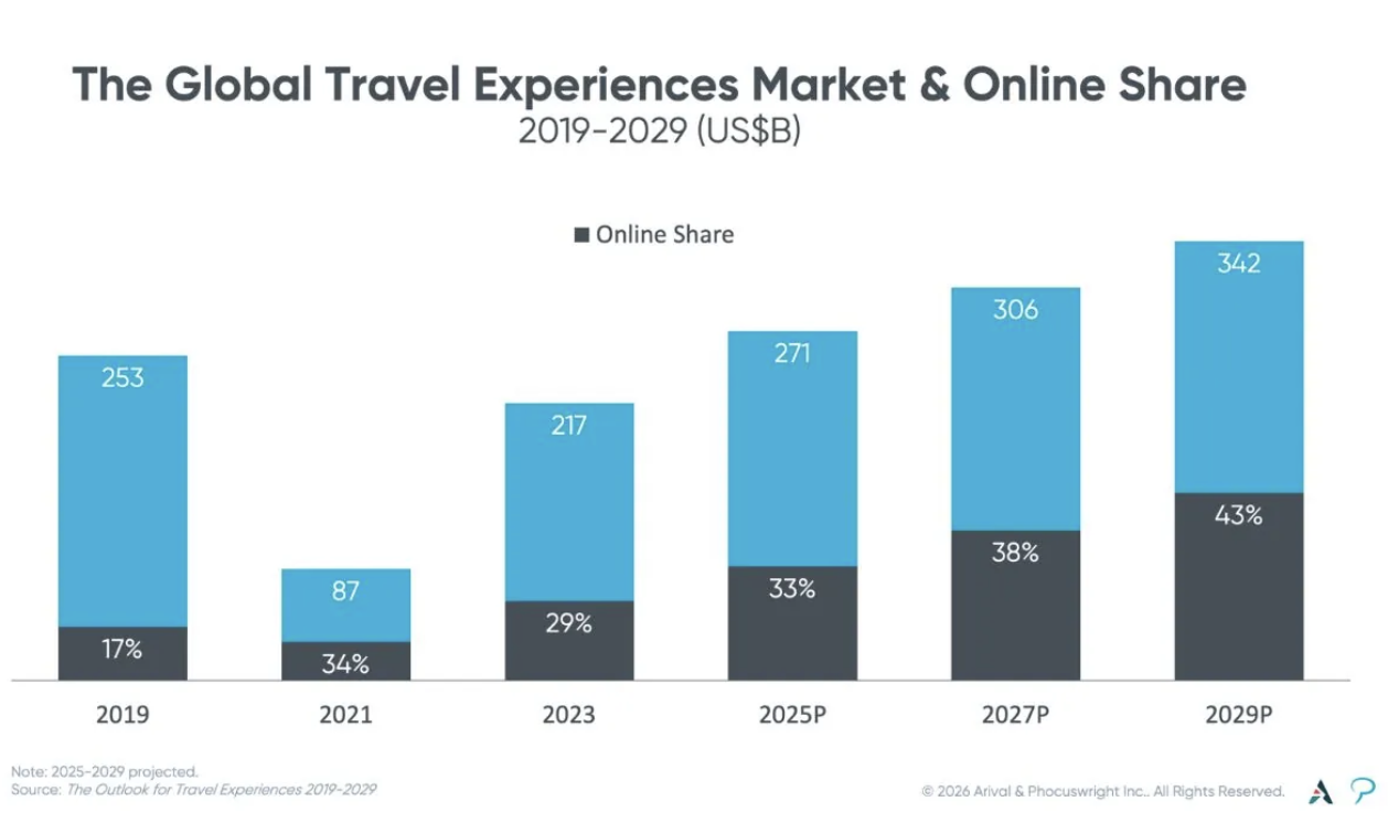 Travel experiences are now central to tourism growth, reaching $271B in 2025 and projected to hit $342B by 2029, growing at 8% CAGR—outpacing the wider travel sector. According to Arival and Phocuswright, experiences now drive destination choice. Online bookings are rising (17% in 2019 to 42% by 2029), yet the sector remains under-digitized, creating major growth opportunities for operators and platforms. (Image: Arival)