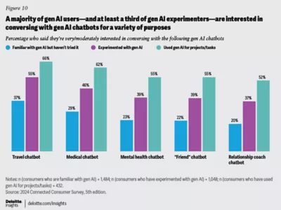 • When it comes to engaging with gen AI-based chatbots for personal issues, Gen Zs and millennials are about twice as likely as older generations to say they’re interested in talking to a chatbot “friend” (44%, vs. 23%), relationship coach (42%, vs. 21%), or mental health counselor (44%, vs. 24%).