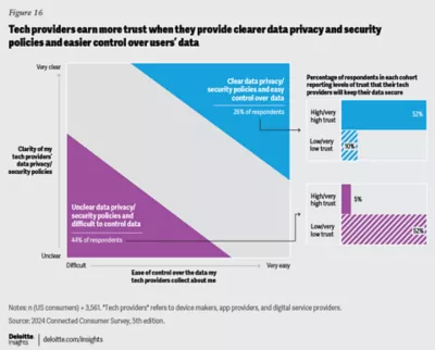 In 2024 Deloitte is seeing greater awareness of the potential harms of digital life. Since 2023, consumers have grown more worried about data-security risks and location- and behavior-tracking. More are experiencing security failures, and more are taking protective actions. They’re also setting more boundaries on their digital use—and that of their children. Consumers are increasingly looking to tech companies to help them find the right balance, give them more control over their devices and data, and ensure that digital life is worth the effort. According to our analysis, tech companies that prioritize transparent data privacy and security policies along with ease of control may be able to earn greater consumer trust and affinity.