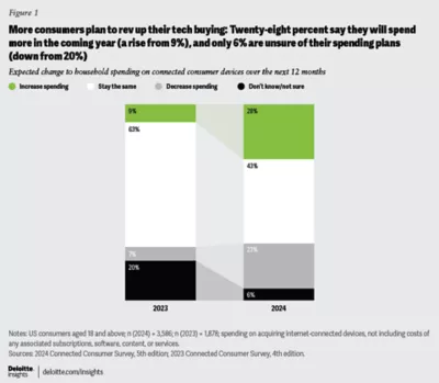 Tech spending is rebounding. Households spent an average of $760 on connected devices in the past year, a slight drop from $800 in 2023. However, 28% plan to increase device spending in 2024—up from 9% last year—while 43% plan to maintain their spending. Device-refresh cycles are accelerating, fueled by AI-enabled features embedded in new devices.