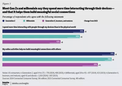 83% percent of consumers believe digital experiences positively impact their lives, up from 78% in 2023. This sentiment is strongest among teens, with 86% reporting benefits. Across generations, consumers cite online shopping, maintaining social connections, and accessing entertainment as key advantages. However, the divide between digital and physical interaction persists: 59% of Gen Zs and 56% of millennials spend more time interacting online than in person.