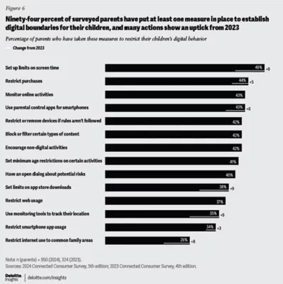 • Nearly all parents have set digital boundaries for their children, with many measures increasing since last year. Common strategies include setting screen time limits, restricting purchases, monitoring online activities, and using parental control apps for smartphones. Forty-one percent of parents surveyed said they enforce age restrictions on certain digital activities, as endorsed by health professionals,8 such as limiting social media use, smartphone access, and unsupervised internet use for younger children.