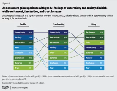• Consumers’ feelings toward gen AI appear to transform as they gain more experience with the technology (figure 8). Very few respondents feel “trust” toward gen AI before they use it, but for regular users, trust is the No. 3 emotion.