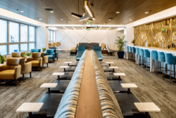 The Club expansion features a new service buffet and additional beverage station to support that higher guest volume. Seating in the expansion is tailored to the needs of the business traveler, with single-seat dining tables, a communal table with a charging source in the center, and power outlets at almost every seat. Throughout the Club, seating has been refurbished to match the elevated look of the newly added space.