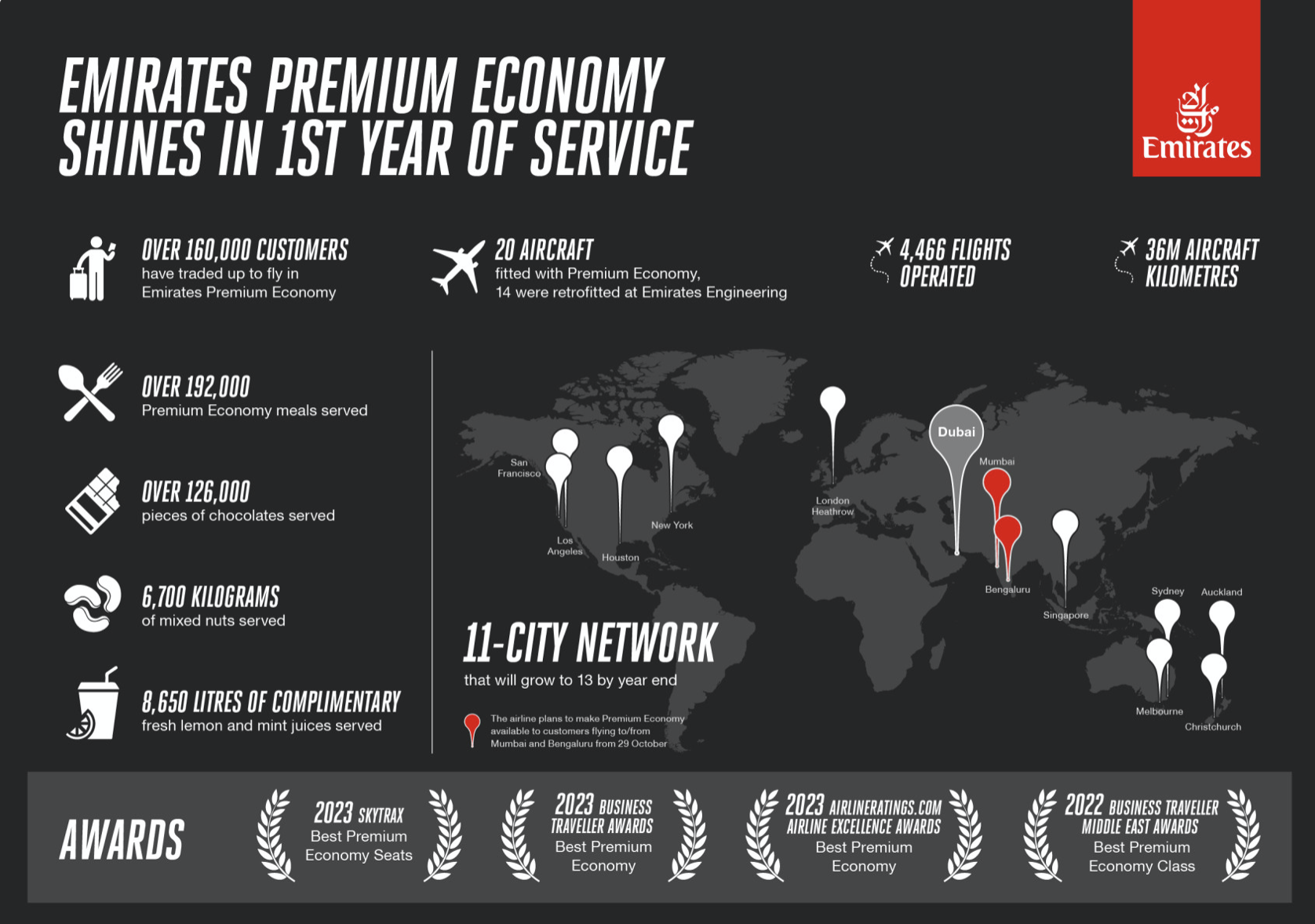 After setting new industry benchmarks in Premium Economy travel, Emirates is celebrating a banner first year of full-service operations with the highly popular cabin class. Over 160,000 customers have traded up to fly in Emirates Premium Economy since it was introduced in August 2022, with strong demand momentum forecasted in the coming months.