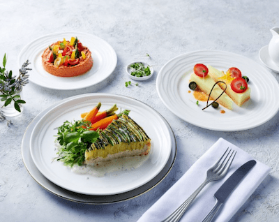 Current vegan meal favourites in Economy Class include a creamy spinach and avocado mousseline, with marinated tofu, blanched snow peas, radish, asparagus, pomegranate seeds, courgette ribbon and sriracha oil; multicoloured quinoa with succulent caramelised pear and celeriac purée, roasted cauliflower, glazed carrots, sautéed kale and lovage pesto; and the hearty flavours of barley risotto with mushrooms, sundried tomatoes, buttered chestnuts, blanched broccolini and toasted pumpkin seeds.