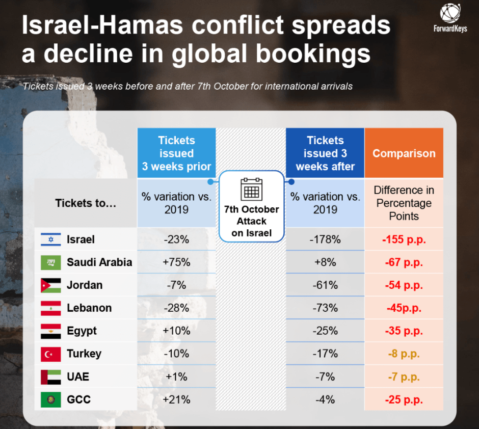 GLOAccording to travel analytics from ForwardKeys, the recent conflict between Israel and Hamas has had a detrimental impact on flights to and from the Middle East, contributing to a global slowdown in the aviation industry. Since the outbreak of the conflict, outbound flight bookings from Middle Eastern countries have decreased by nine percentage points. The slowdown is evident in various regions, with the Americas experiencing a 10-point decrease, Asia Pacific, Europe (including Israel), and Africa each slowing by two points.