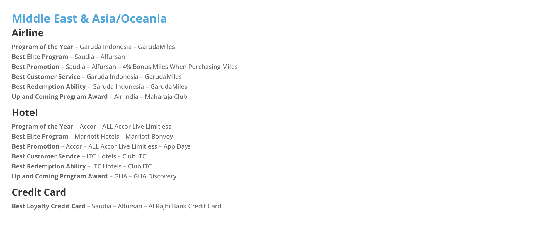 GarudaMiles dominated in the Middle East & Asia/Oceania region, capturing: