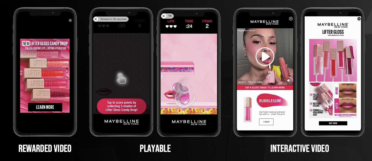 The campaign featured a series of user-initiated ad formats—a Rewarded Video, a custom Playable, and Activision Blizzard Media’s brand-new Interactive Video—all designed to deliver players an engaging and immersive experience. These interactive ads visually highlighted the vibrant Lifter Gloss Candy Drop collection, compelling users to explore the range of shades available. The Playable provided a distinctive gamified experience that integrated elements of both Maybelline and Candy Crush Saga while the Interactive Video enticed users to delve deeper into the product with a strong call to action to drive Consideration. Utilizing creative emphasizing strong branding and prominent product placement, Maybelline heightened player engagement through exploratory and rewarding ad experiences.