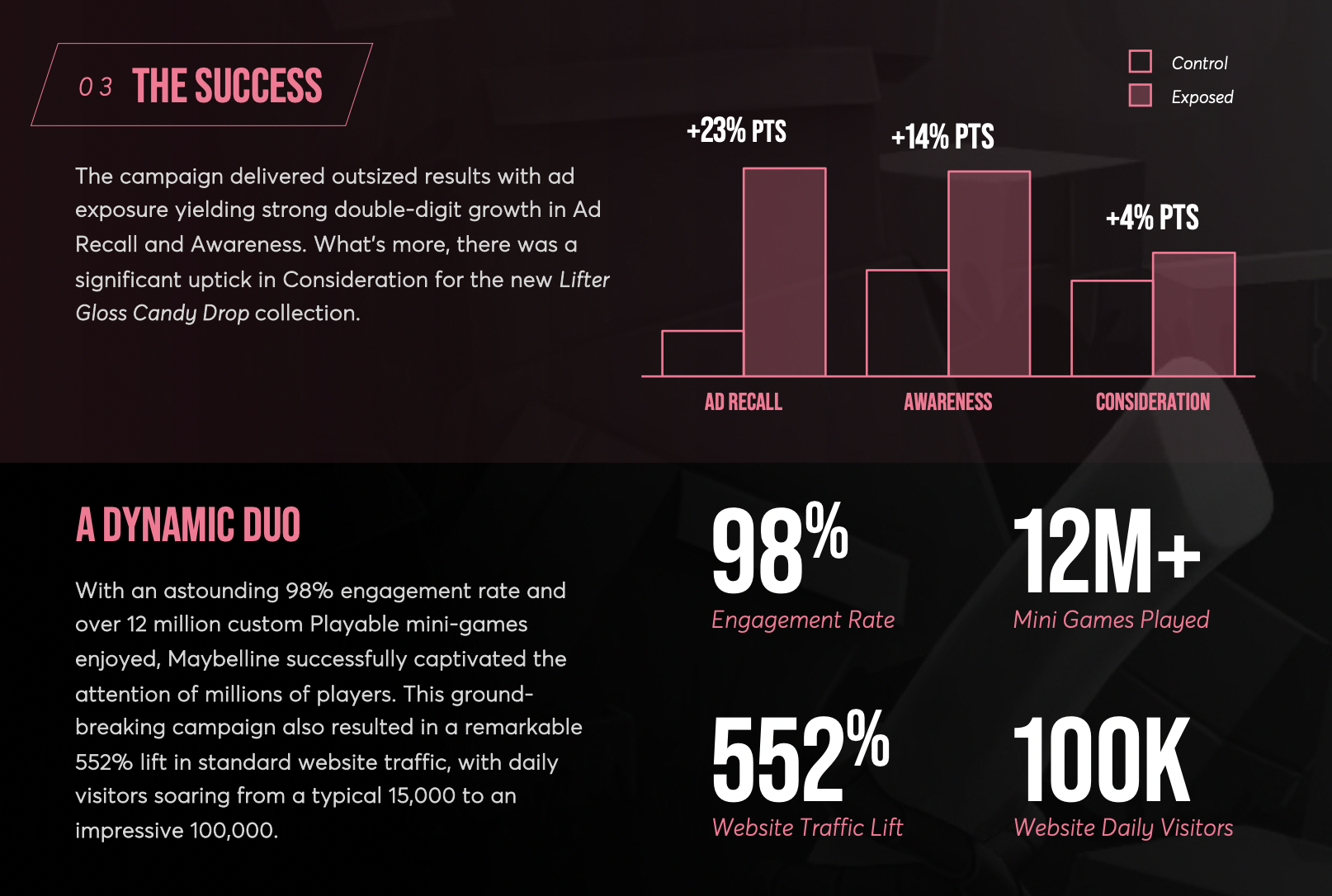 Maybelline partnered with Activision Blizzard Media to launch an innovative activation for its Lifter Gloss Candy Drop that creatively reached and engaged new audiences. With strong brand alignment and product synergy, the collaboration between Maybelline and the iconic Candy Crush Saga bolstered brand resonance through a unique, eyecatching campaign that celebrated candy, color, and hydrated lips. Boasting hundreds of millions of monthly players, Candy Crush Saga provided Maybelline a strategic platform to tackle its key objectives. From driving customer acquisition and fostering loyalty to amplifying product awareness and deepening engagement, Maybelline created meaningful connections with both players and beauty enthusiasts alike, leaving a memorable ad experience.