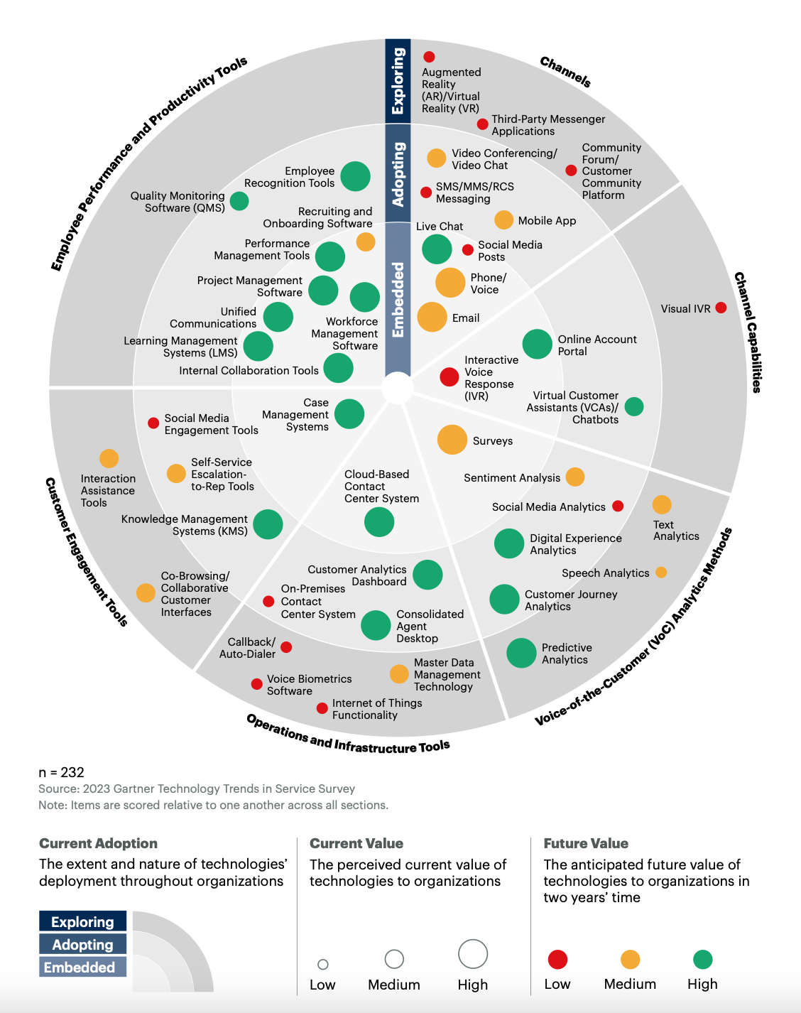 Customer service and support leaders across industries and business models benchmarked their plans for 45 established and emerging technologies and capabilities:
