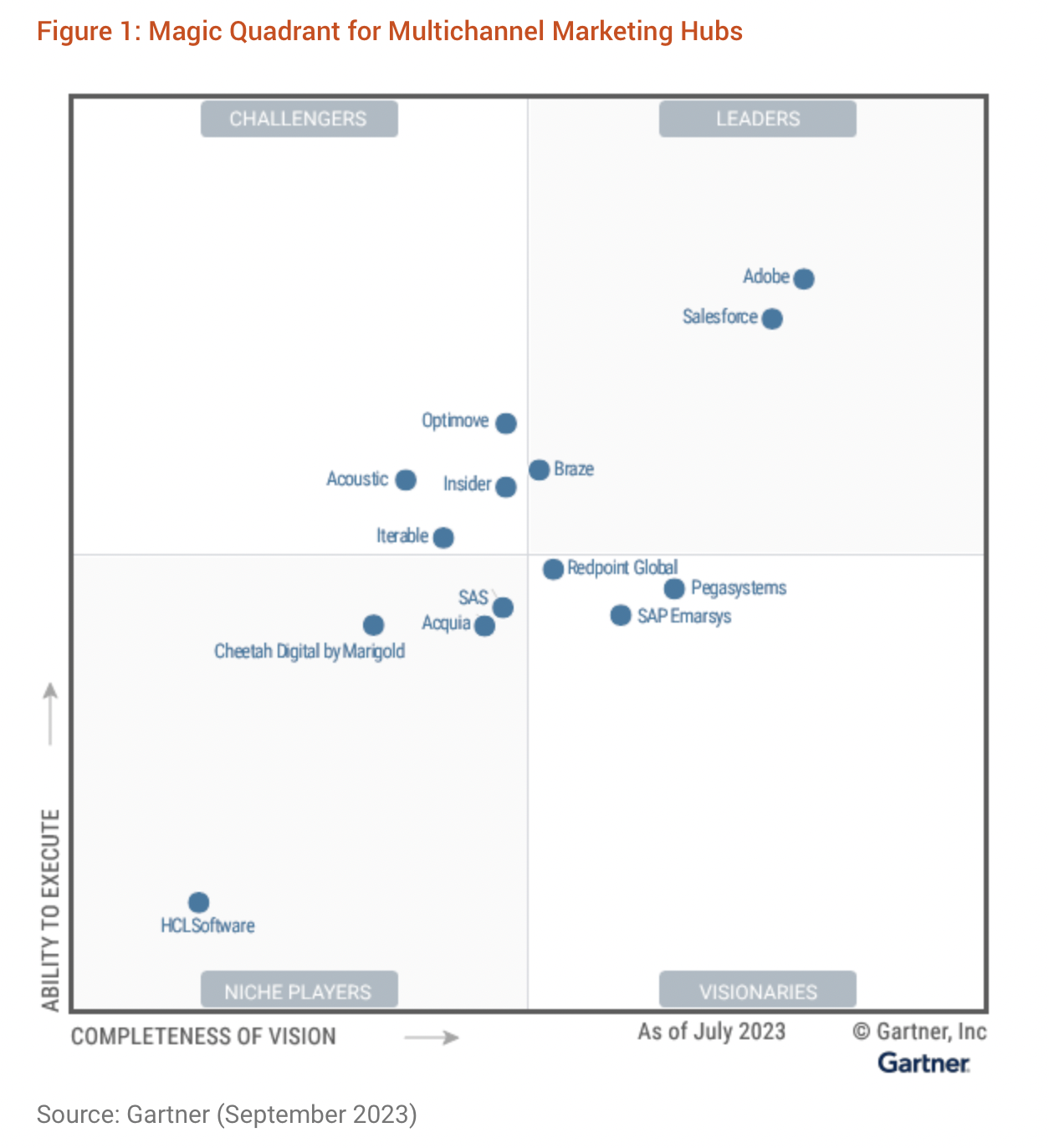 Latest Gartner multichannel marketing report covers X providers. Gartner defines the multichannel marketing hub (MMH) as a technology solution that orchestrates a company’s communications and offers to customer segments across multiple channels (including websites, mobile messaging, social, direct mail, call centers, paid media and email, integration of marketing offers/leads with sales for execution in both B2B and B2C environments).