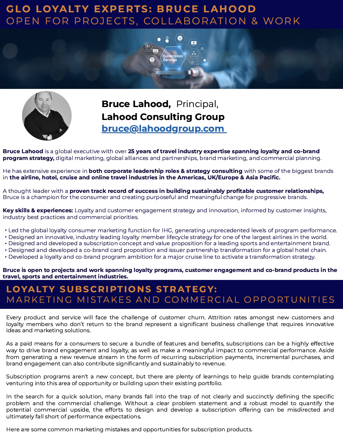 Bruce Lahood (#openforprojects) a global loyalty expert, outlines key strategies and pitfalls in designing subscription-based customer loyalty programs. He emphasizes customer-centric design, value exchange, lifecycle marketing, and enterprise-wide integration to ensure engagement, minimize churn, and drive sustainable revenue growth through thoughtful, data-informed execution.