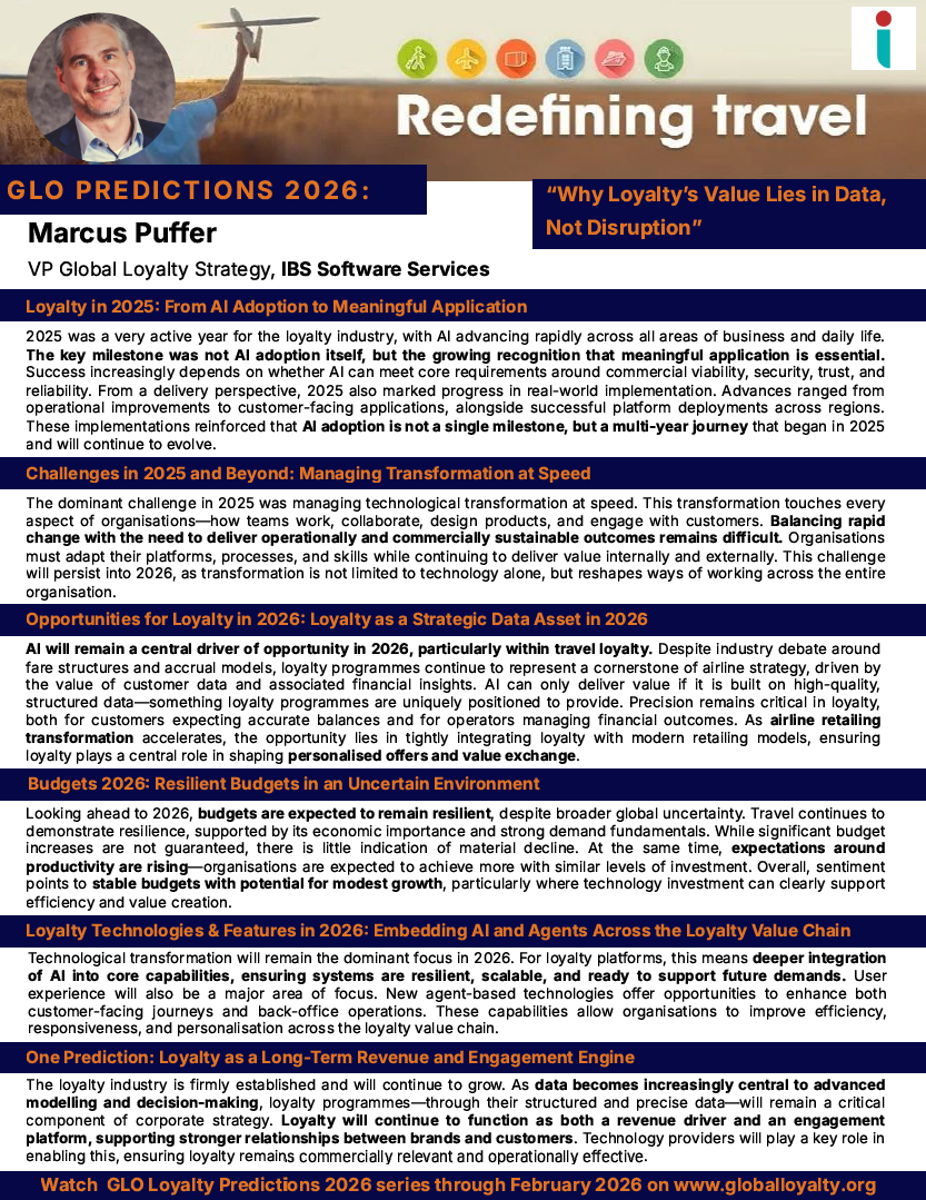 2025 marked a shift from AI experimentation to the need for meaningful application in loyalty. As technological transformation accelerates, organisations face the challenge of balancing speed with commercial and operational sustainability. In 2026, loyalty’s value lies in its structured data and tight integration with modern travel retailing. With resilient budgets and rising productivity expectations, loyalty will remain a core revenue and engagement engine—powered by data and AI.