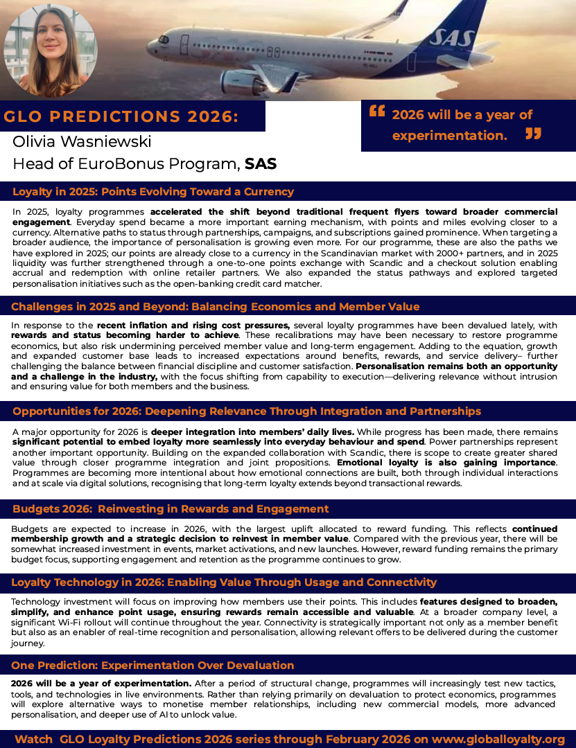 In 2025, loyalty moved beyond frequent flyers toward broader everyday engagement, with points evolving closer to a currency and alternative paths to status gaining ground. Inflation-driven recalibration made rewards harder to achieve, increasing pressure on perceived value. In 2026, the focus shifts to deeper daily integration, stronger partnerships and emotional loyalty, supported by increased reward investment, better connectivity and a year of experimentation over devaluation.