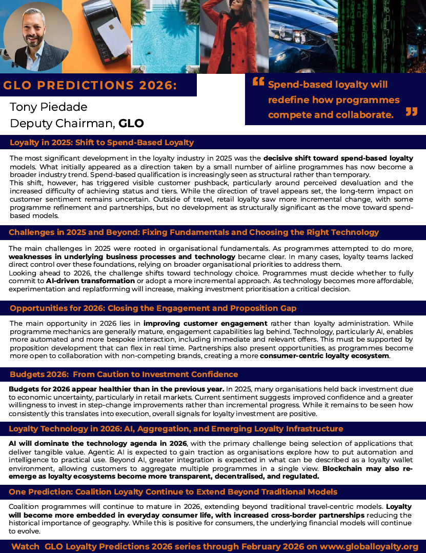 2025 marked a decisive shift toward spend-based loyalty, moving from isolated airline models to an industry-wide standard. While structural, the change has triggered customer pushback and renewed focus on relevance. In 2026, opportunity lies in improving engagement through AI, stronger propositions, and more open partnerships. With healthier budgets and maturing coalitions, loyalty is set to become more embedded in everyday consumer life, beyond category and geography.