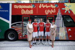 Gunners Discover Dubai’s Magic with Emirates Arsenal first team players David Raya, Jorginho and Mikel Merino were treated to a tour of Dubai to experience the city’s newest architectural icons and storied landmarks. After being picked up on a hop on hop off City Sightseeing bus, the players were welcomed by Emirates Cabin Crew, who offered bite-sized facts and insights about each landmark on the tour.