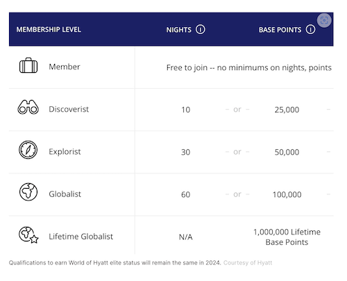 The program comprises four membership levels: Member, Discoverist, Explorist, and Globalist. Membership starts at the basic, free-to-sign-up Member level, followed by three ascending elite tiers. Advancement to elite tiers involves meeting specific criteria, such as staying a certain number of nights in Hyatt hotels or accumulating base points (usually five points per dollar spent) within a calendar year. Each tier offers various benefits, including discounted room rates, premium internet, room upgrades, late checkout, and Club lounge access. Fortunately, none of the requirements for achieving elite status will undergo changes in 2024. The qualification criteria will remain consistent as follows: