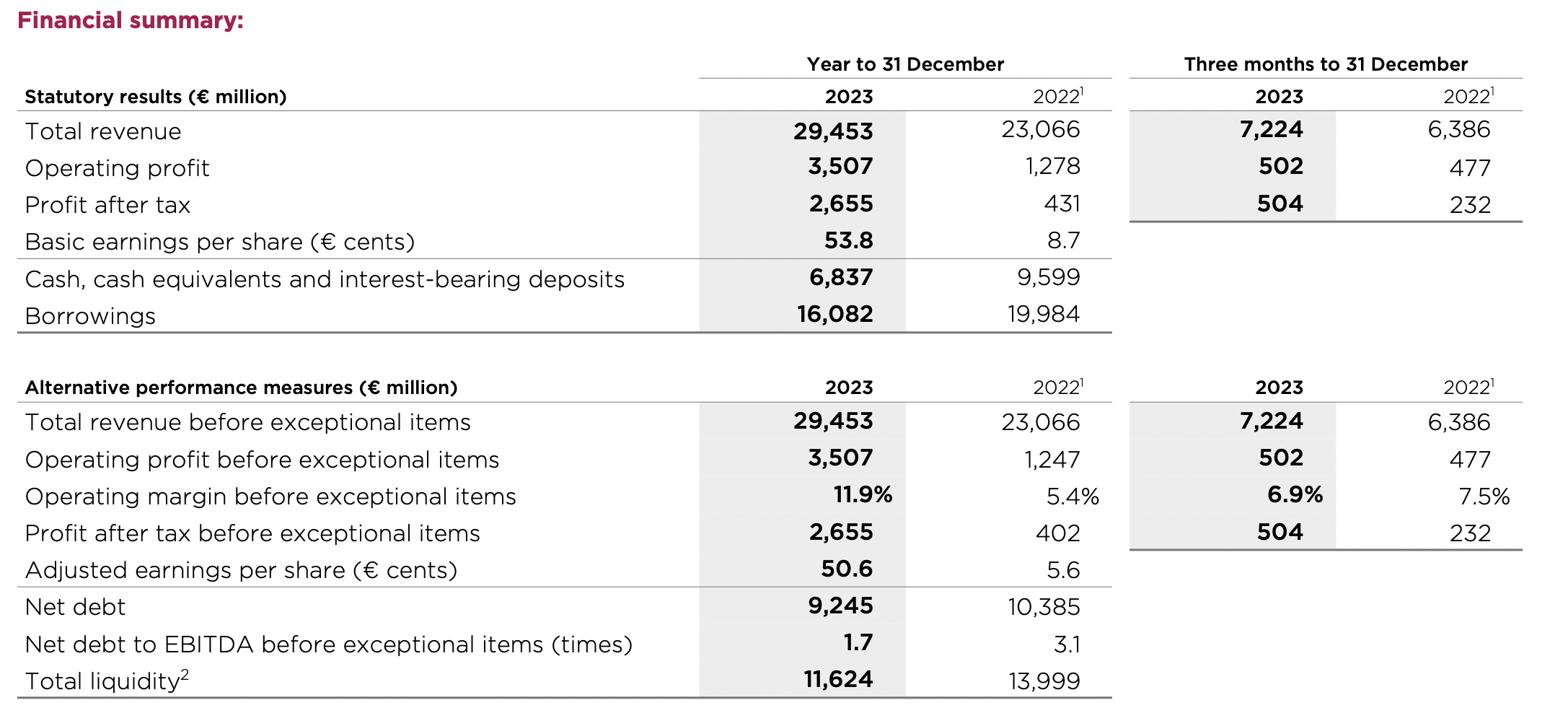 Full year 2023 operating profit before exceptional items of €3,507 million significantly higher than last year and ahead of 2019