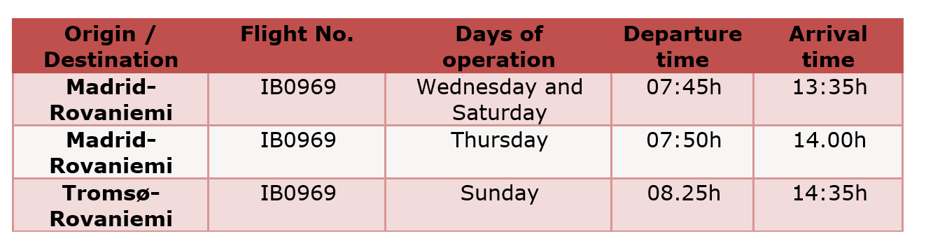 Iberia scheduled flights to Rovaniemi until 1 March, with up to 4 flights a week in December, on Wednesdays, Thursdays, Saturdays and Sundays. These will be the most exciting flights in the entire Iberia network, as on board there will be letters to be delivered to Santa Claus and delicious Christmas cookies.