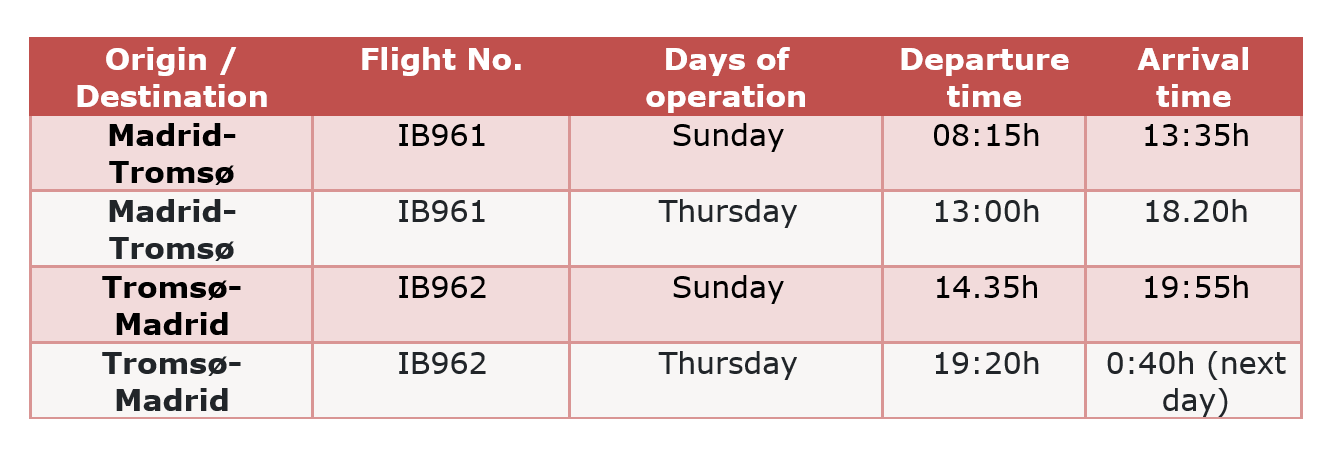 Iberia has put 10,044 seats on sale to travel to Tromsø until 2 March, offering two weekly flights, on Thursdays and Sundays.