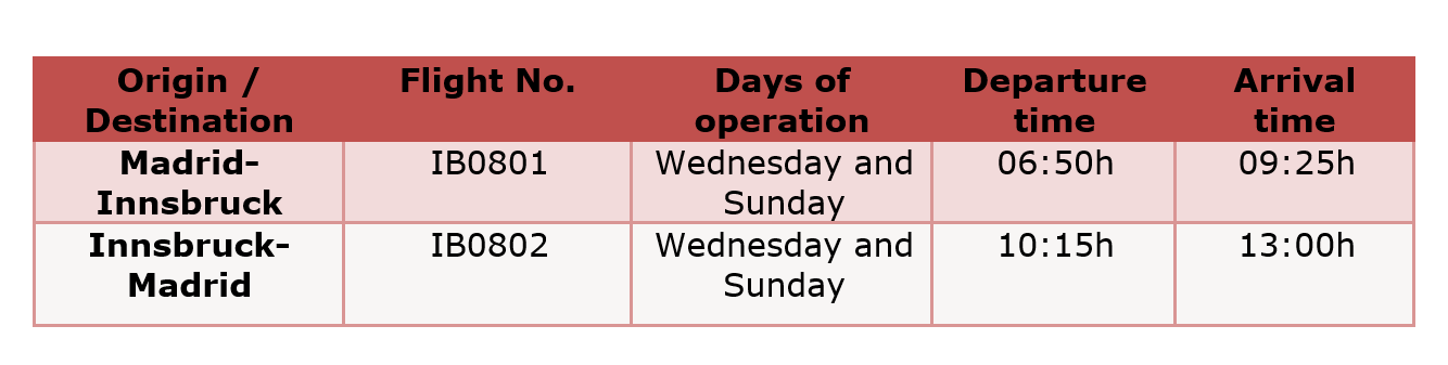 From yesterday until 26 March 2025, Iberia offers two weekly flights, on Wednesdays and Sundays, between Madrid and Innsbruck. In total, 12,648 seats have been put on sale between both cities.