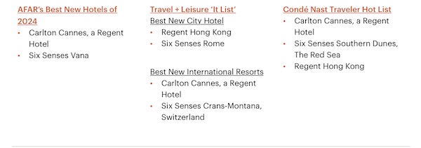 Nine top titles awarded to IHG properties – A total of four Six Senses and two Regent hotels are featured in Condé Nast Traveler Hot List, Travel + Leisure’s It List and AFAR’s Best New Hotels.