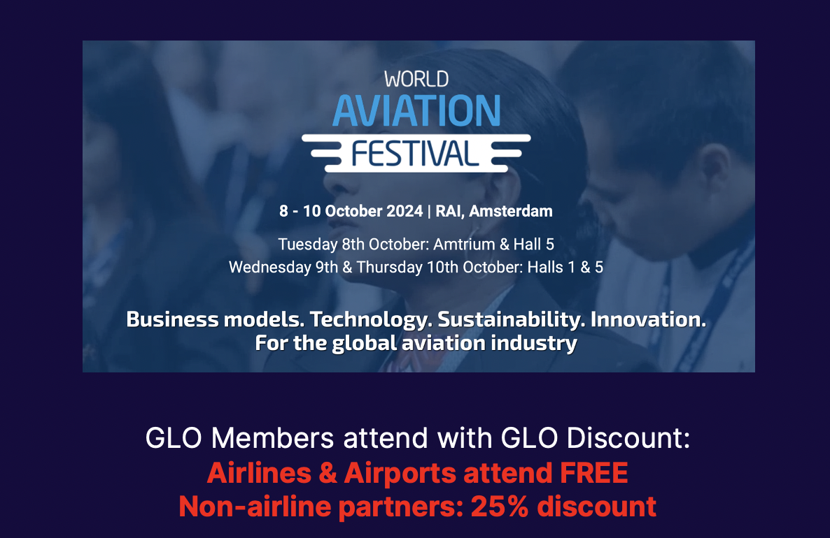 Join GLO next week at the World Aviation Festival in Amsterdam for a series of presentations and interviews with leading airline executives on CX and loyalty from Air France-KLM, Qatar Airways, Emirates, Pegasus Airlines, United Airlines, as well as solution providers - Amazon Web Services (AWS), Amadeus, Plusgrade, etc. GLO member airlines & airport executives attend for free GLO member solution providers and vendors have 25% discount code (please contact us for the code).