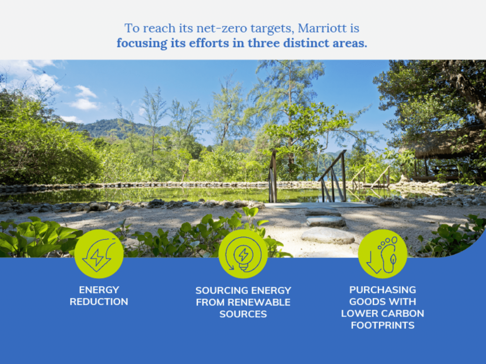 To reach its net-zero target, Marriott is focusing its efforts in three distinct areas: energy reduction, sourcing more energy from renewables, and purchasing goods with lower carbon footprints across its portfolio of over 8,800 properties in 139 countries and territories.