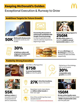 Targeting 50,000 restaurants by 2027; ushering in fastest period of growth in brand's history. Expanding one of the world's largest loyalty programs from 150 million to 250 million 90-day active users by 2027. Connecting thousands of restaurants worldwide with Google Cloud technology to improve operations and customer & crew experience, beginning in 2024