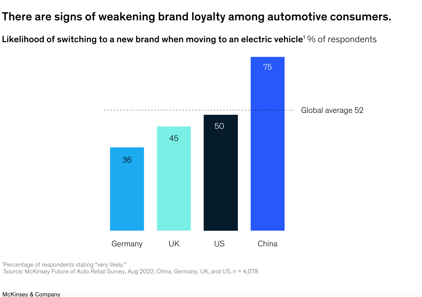 Brand loyalty put to the test – In times of systemic change, consumers are more willing to abandon long-standing loyalties. This presents a test for established brands (Exhibit 2). More than 50 percent of respondents say they may try a new brand when they switch to electric. And if only BEVs are considered, the proportion rises to 70 percent.