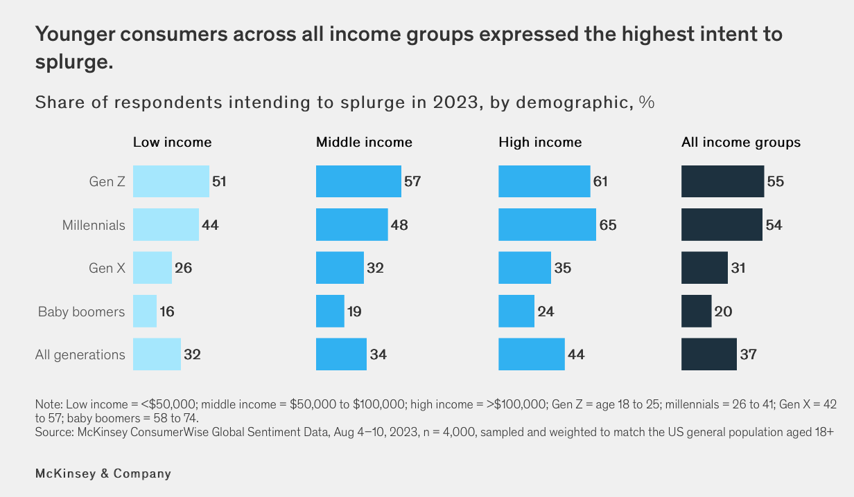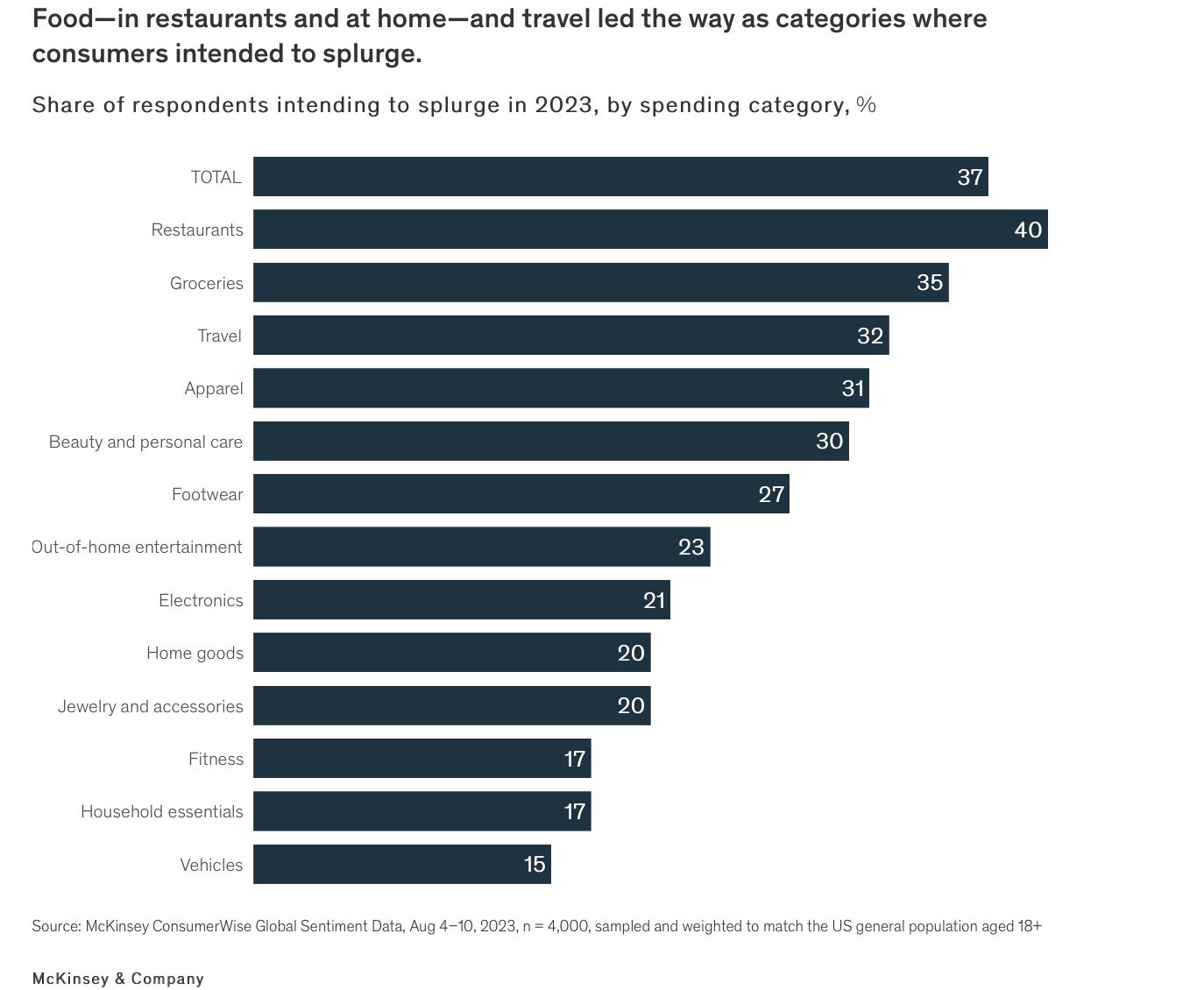 - Food and travel topped the list. Food and travel continued to be splurge-worthy categories among US consumers. Over the summer, 40 percent of Gen Z and millennials reported an intent to splurge on restaurants, while 45 percent of boomers said they intended to splurge on travel, more than any other category for that age group.