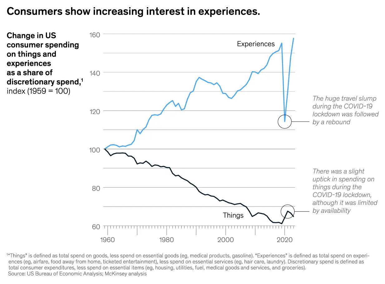 Despite the fact that US consumers’ spending on things rose slightly and spending on experiences slumped during the COVID-19 pandemic, the historic multidecade trend is still intact – “expereinces” are prefered to “things”.
