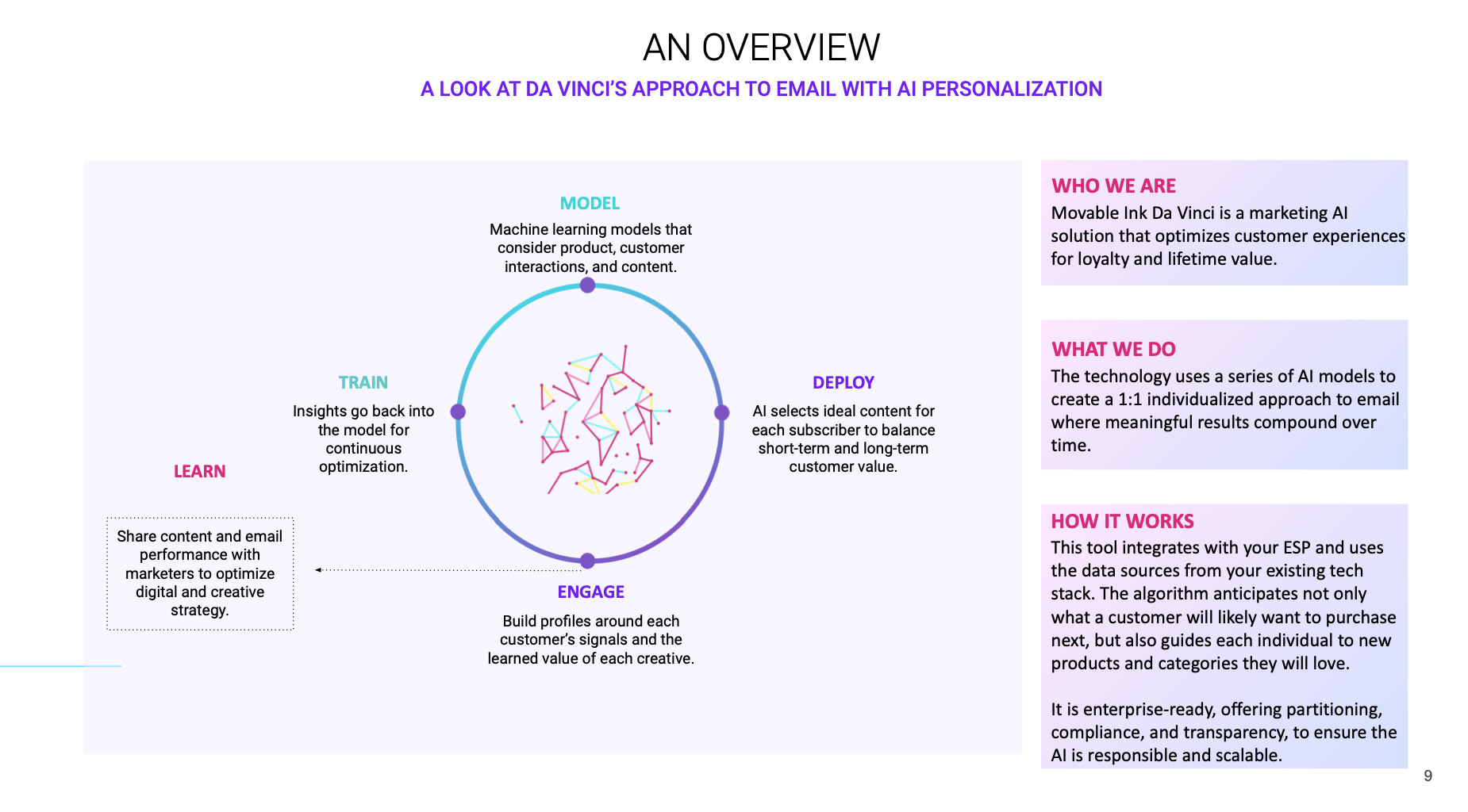 Movable Ink Da Vinci is a cutting-edge AI product that empowers marketers to create hyper-relevant, 1:1 experiences that engage customers on a deeper level. Whether it’s category pairing discovered through machine learning or dynamic content blocks populated based on user behavior, Da Vinci makes it easy to deliver truly unique experiences that capture attention and drive conversions.