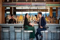 A man and a woman are sitting on two bar stool chairs at a hotel bar sipping cocktails. She is holding a glass of champagne and he is holding a glass of red wine. There is a view of mountains in the background behind the bar.