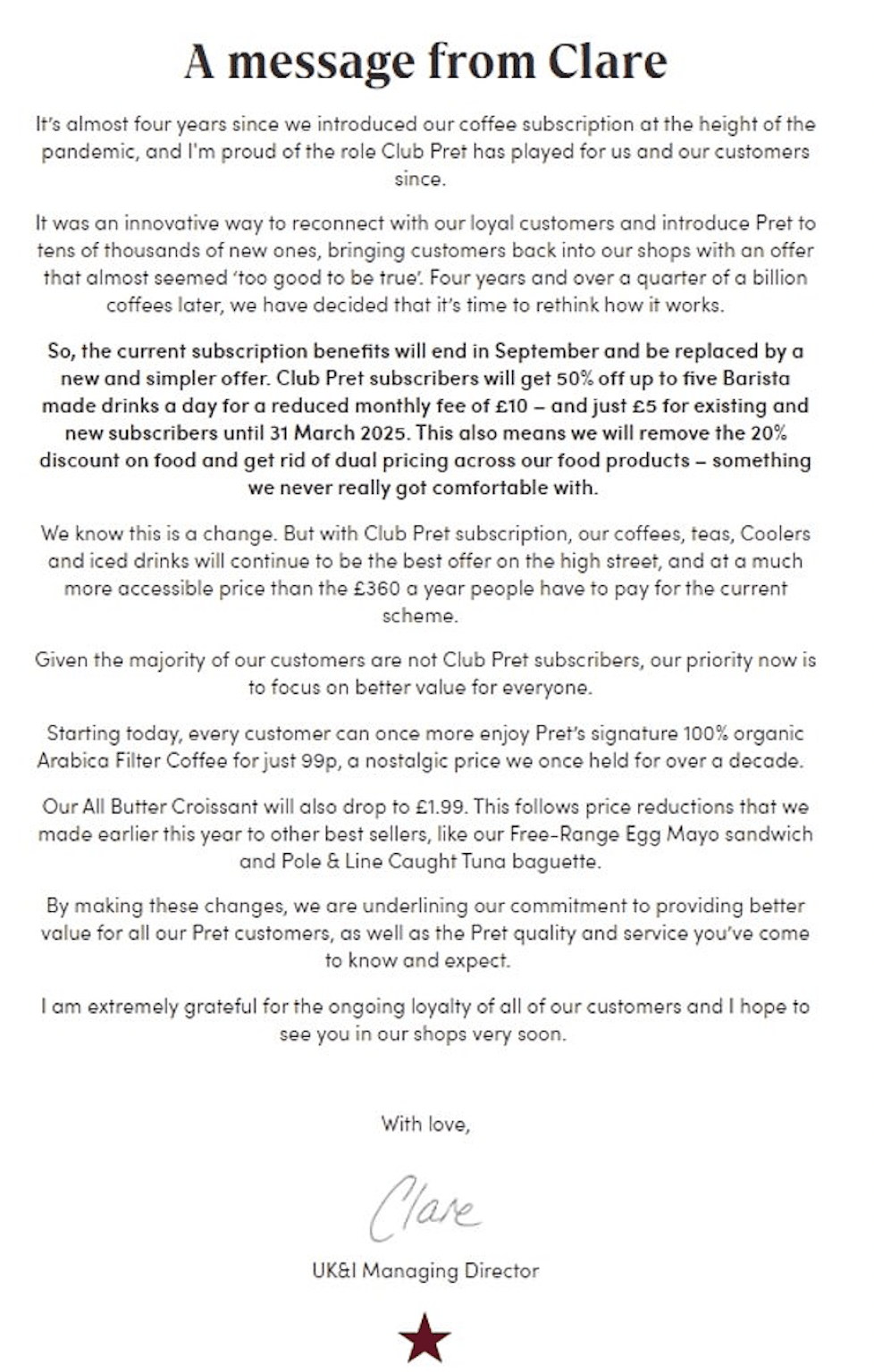 With the change, subscribers will get 50% off up to five Barista-made drinks per day for a reduced monthly fee of £10, and just £5 for existing and new subscribers until March 31, 2025. Coffee enthusiasts will also enjoy some price reductions. Pret’s signature 100% organic Arabica Filter Coffee will now cost just 99p, down from £1.80. Additionally, the classic All Butter Croissant will be priced at £1.99, down from £2.30.