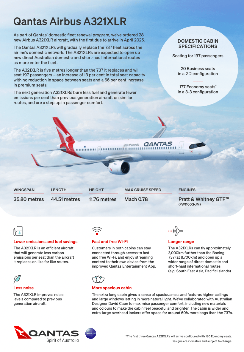The A321XLR’s cabin will feature wider and more comfortable seats compared to the 737, accommodating 197 passengers across two classes with new features. The aircraft’s extended range will enable Qantas to operate more direct routes domestically and internationally, with improved efficiency and reduced emissions