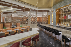 Inspired by both the natural and manmade beauty of Los Angeles, the lounge color palette evokes the landscape of Southern California. Sunset hues, complemented by leather and walnut accents, color the Icon Bar. The airiness of the coast is reflected in the Verde Emerald quartzite and onyx back bar.