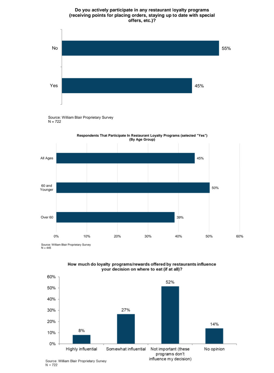 - When asked how much loyalty programs influenced a respondent’s decision on where to eat, 52% of said it was not an important factor, while 35% said that it was at least somewhat influential (14% had no opinion).
