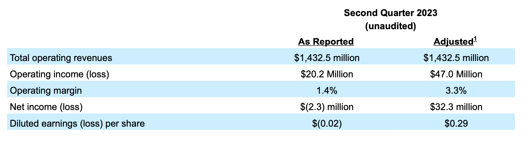 For the second quarter 2023, Spirit reported a net loss of $2.3 million, or a net loss of $0.02 per diluted share. Excluding special items, adjusted net income for the second quarter 2023 was $32.3 million , or an adjusted net income of $0.29 per diluted share .