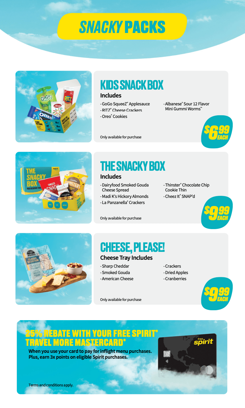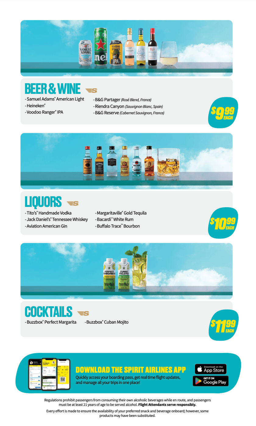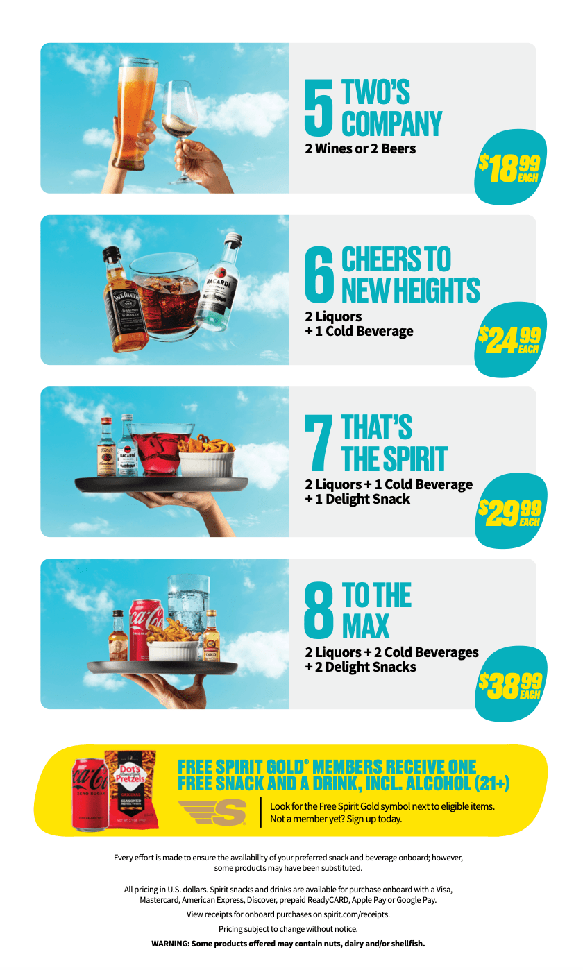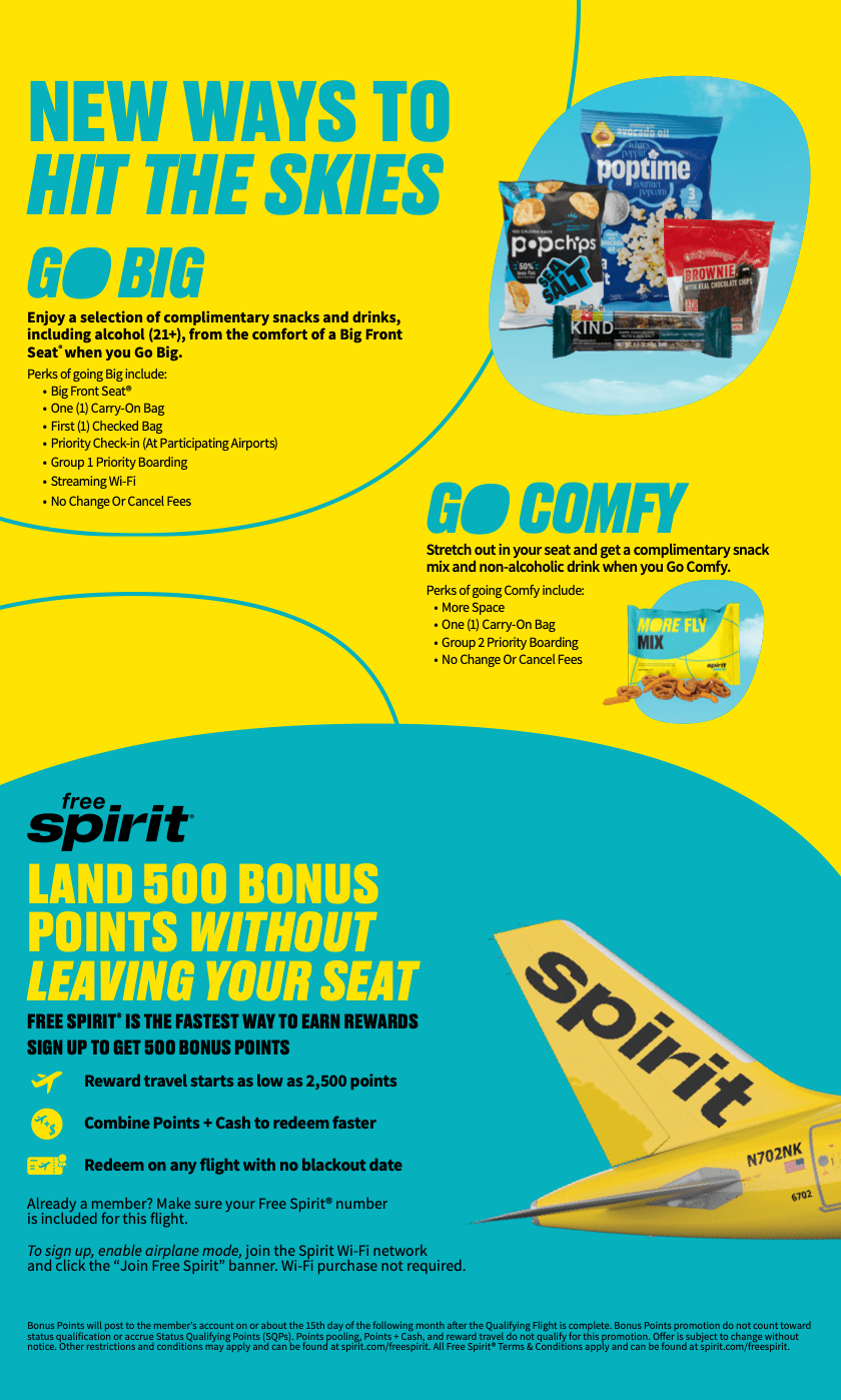 Additionally, Guests who Go Big can enjoy new complimentary snacks and drinks, including alcoholic beverages, while Guests who Go Comfy can enjoy Spirit’s complimentary More Fly snack mix and a non-alcoholic drink.