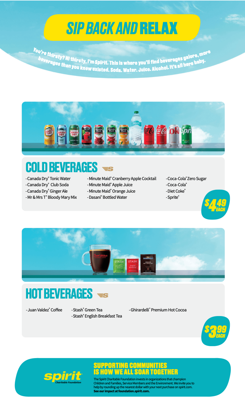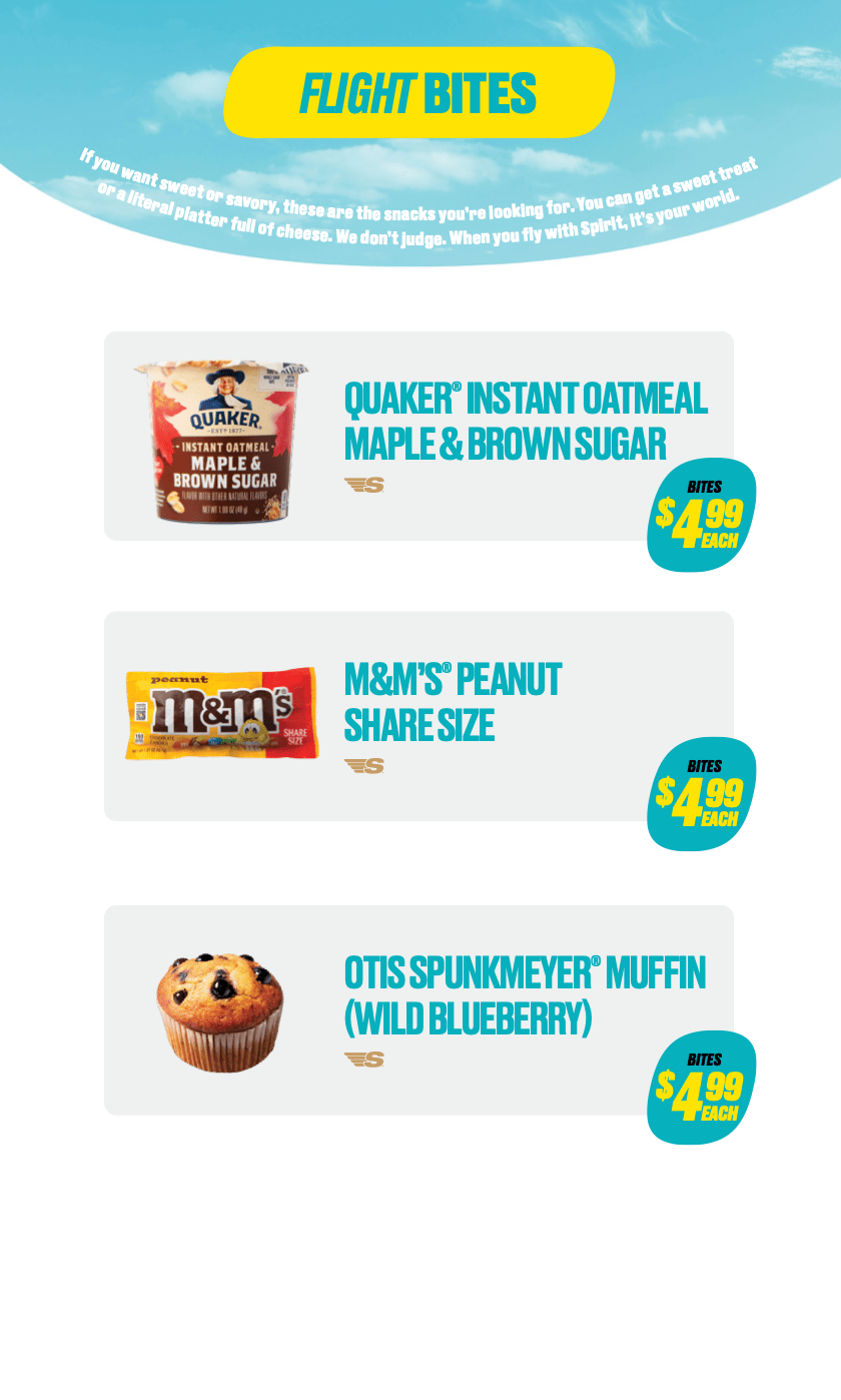 Spirit is bringing its “More Fly” brand campaign to the inflight menu while introducing exciting new menu items. Guests can browse tasty selections including more combo options, which offer better selections for savings. Travelers looking for a sweet treat or something savory will have new options to choose from including Quaker® Instant Oatmeal Maple & Brown Sugar, Twisted Noodles® Veggie Ramen, Grandma’s® Mini Sandwich Cremes Vanilla, Stash® English Breakfast tea, Coca-Cola® Zero Sugar, Samuel Adams® American Light, Voodoo Ranger® IPA and Buzzbox® Cuban Mojito.